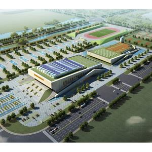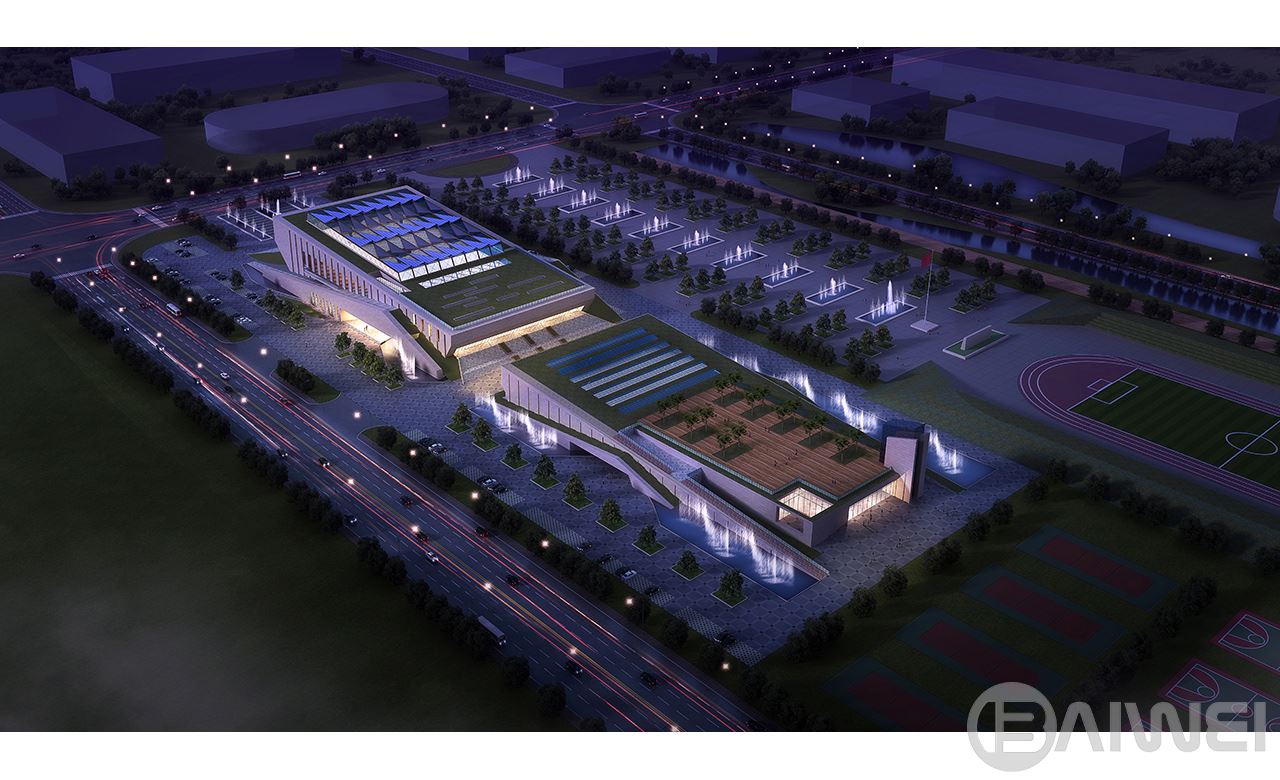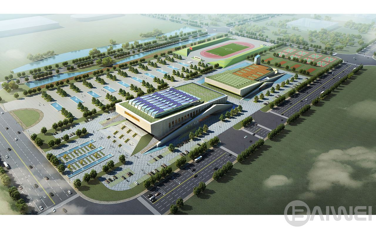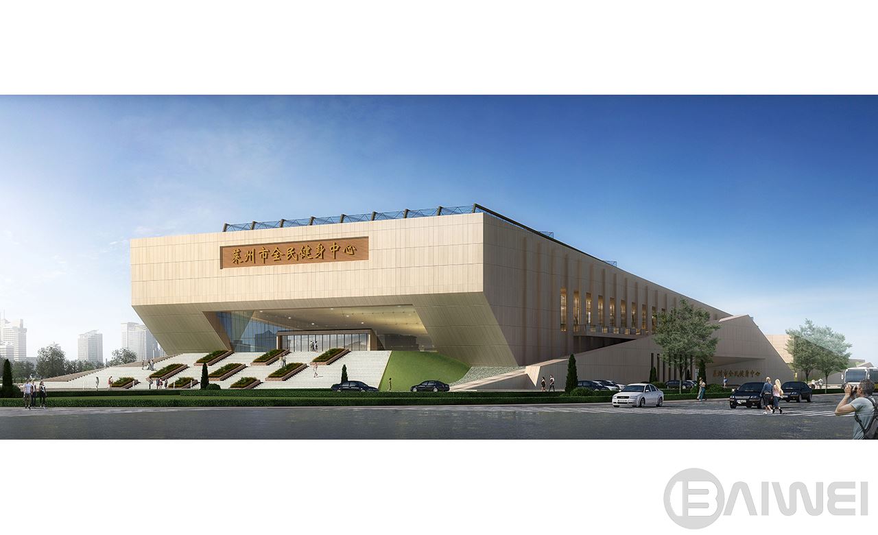 “靈石合出,福澤東萊”。本方案以:“靈石合出接祥瑞,全民健身福東萊”為設(shè)計(jì)主題,以彰顯萊州特色的山石文化。通過交匯而出的兩個(gè)石塊形成建筑基本體量,輔以流暢的線條和當(dāng)?shù)靥禺a(chǎn)的石材,打造出渾然天成又極具萊州特色的全民健身場所。建筑順應(yīng)地形,采用南北向矩形布局。同時(shí)根據(jù)用地周邊道路情況分別在場地南側(cè)的北苑路設(shè)置禮儀性人行主入口;東側(cè)的東嶺路設(shè)置機(jī)動(dòng)車出入口 ??紤]到體育場館使用上的特點(diǎn),地面停車的方式更為方便,停車場沿場館周邊分散式布置。平面功能以主體育館為中心,周邊配以輔助空間,其中觀眾、賽事組織、運(yùn)動(dòng)員、貴賓、辦公人員等均有其單獨(dú)的入口,以達(dá)到分區(qū)明確,流線清晰,互補(bǔ)干擾的設(shè)計(jì)目的。同時(shí)訓(xùn)練館與主體育館之間設(shè)置采光中庭,不但作為空間過度,豐富了內(nèi)部空間同時(shí)還解決了大進(jìn)深帶來的采光問題。