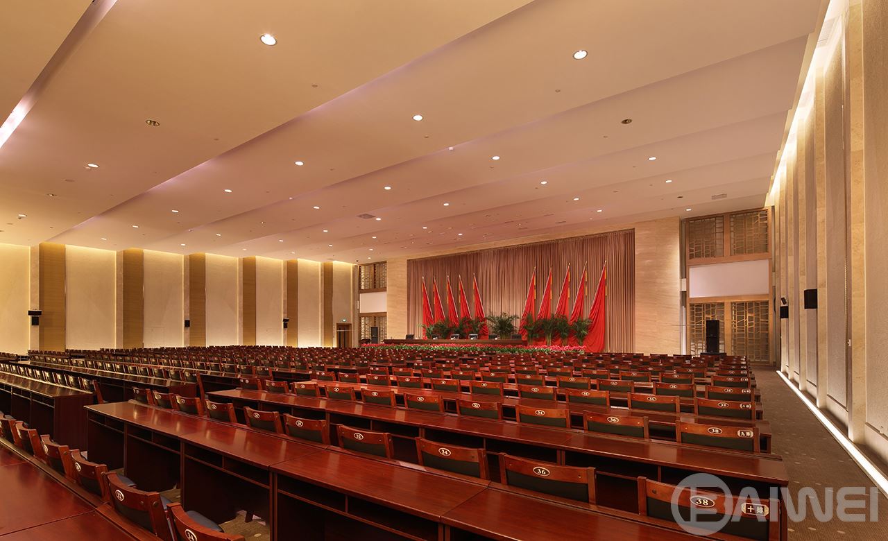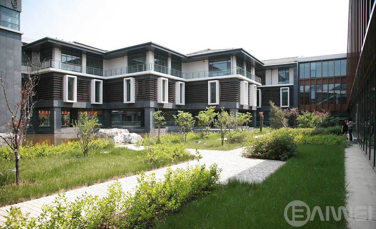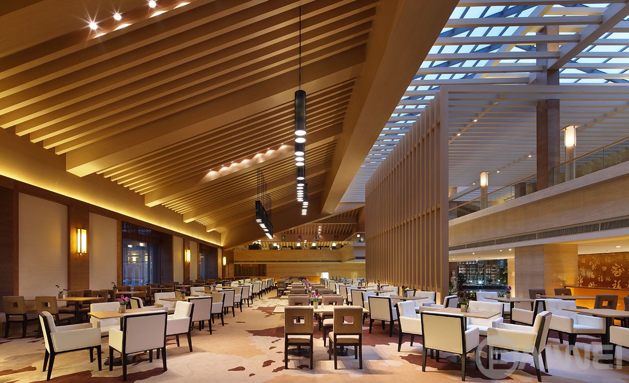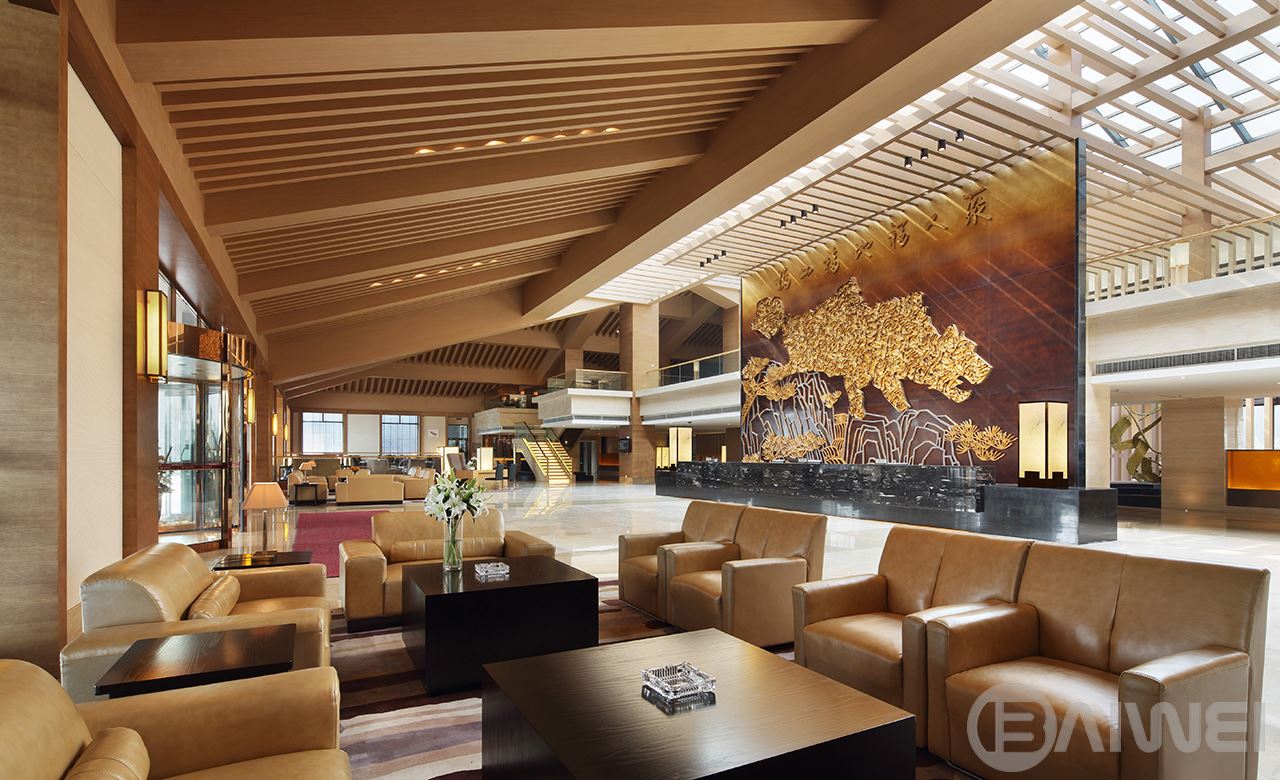立面設(shè)計(jì)尊重地域建筑風(fēng)格特色,商務(wù)賓館采用深灰色瓦屋面,灰色石材墻面以及大玻璃窗相結(jié)合,整體建筑顯得高貴大方且穩(wěn)重典雅。整體立面強(qiáng)調(diào)比例劃分,特別在檐口和柱廊的細(xì)部處理方面,更具匠心??禈分行牟捎蒙罨疑饘偻鈮γ妗咨呐c玻璃幕墻,兩者建筑風(fēng)格協(xié)調(diào)統(tǒng)一,整個(gè)建筑群渾然一體。