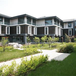 煙臺(tái)福山商務(wù)賓館是集住宿、餐飲、商務(wù)會(huì)議、康體娛樂為一體的綜合性涉外賓館,該項(xiàng)目充分利用新技術(shù)、新材料、新工藝,力求成為福山區(qū)的標(biāo)志性建筑。本工程為一個(gè)建筑群落,南北長(zhǎng)約160米,東西長(zhǎng)約133米。整體空間形態(tài)采用了中國(guó)傳統(tǒng)的院落式布局。西部斜邊沿內(nèi)夾河,景色宜人,設(shè)計(jì)為客房樓,與斜邊相應(yīng)錯(cuò)落布置,形成韻律感極強(qiáng)的空間形態(tài)。建筑分成三個(gè)部分:主入口大廳、客房樓和配樓。三部分有機(jī)結(jié)合,高低錯(cuò)落,圍合成大小不一、形狀各異的院落若干。平面布局上注重功能分區(qū),分流的要求,運(yùn)行路線便捷,管線經(jīng)濟(jì)合理的工程技術(shù)要求。餐飲、客房、后勤分別設(shè)有出入口,既互不穿插又互相聯(lián)系;水平、垂直交通便捷、安全??禈分行脑诙釉O(shè)有連廊與西側(cè)的商務(wù)賓館相連通。兩者有機(jī)結(jié)合,高低錯(cuò)落,形成韻律感極強(qiáng)的空間形態(tài)。