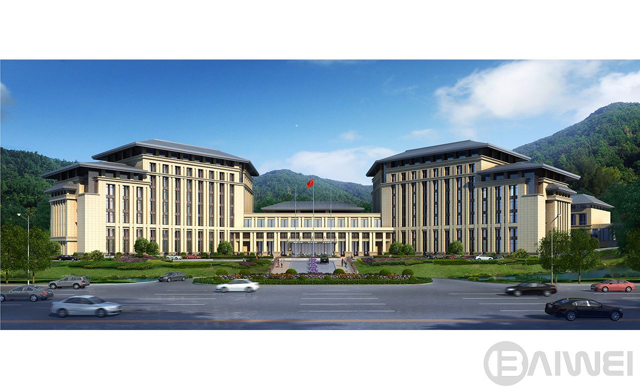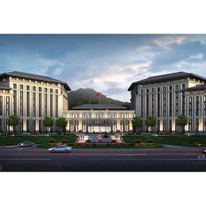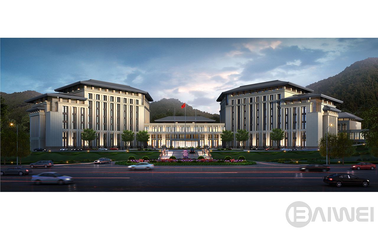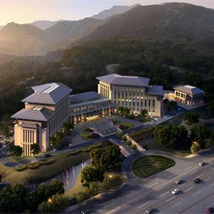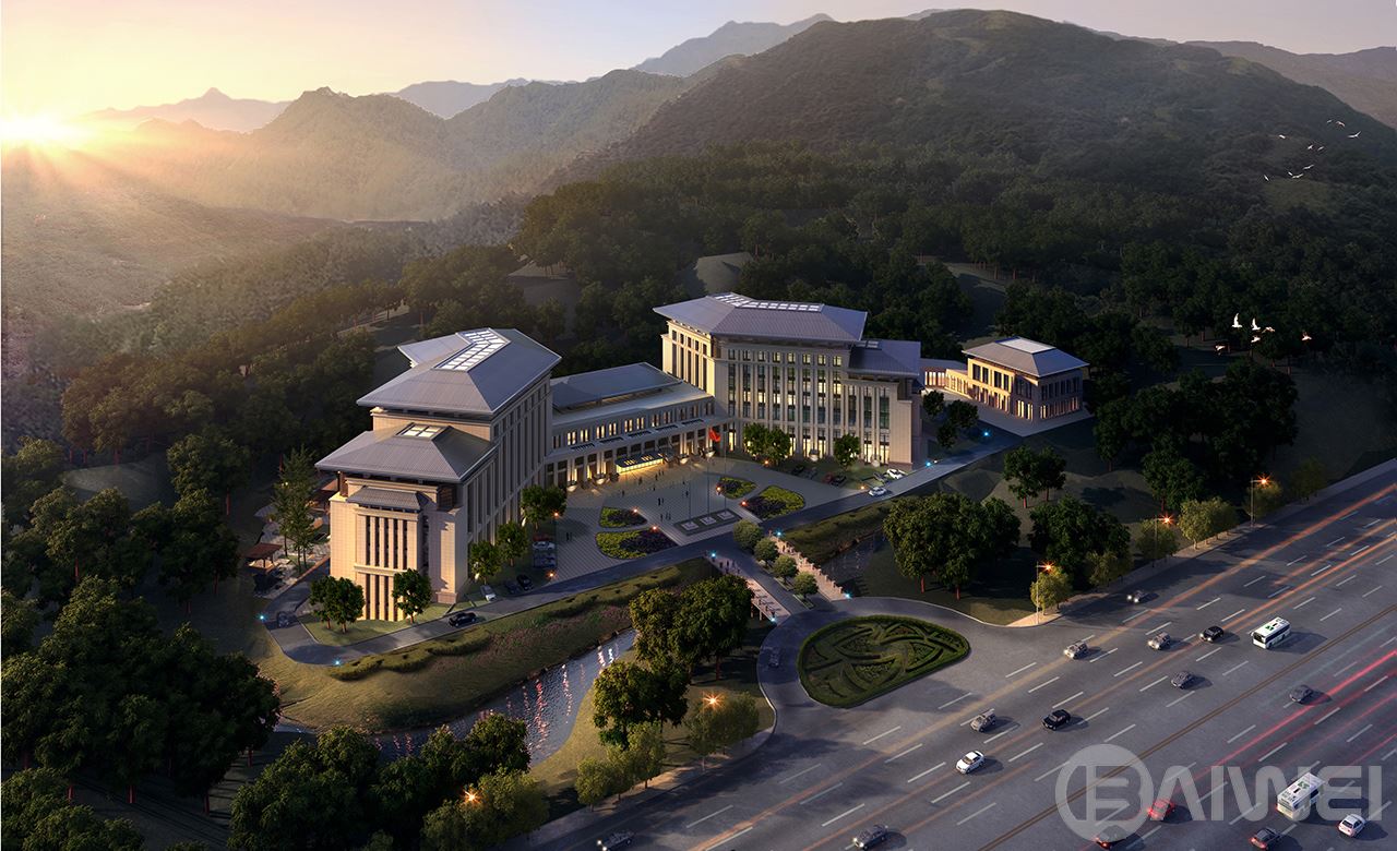 場地內用地高差起伏較大,故項目的規(guī)劃布局設計圍繞“依山順勢”的山地建筑思想,結合三面環(huán)山的自然地貌走勢,以“圍合”與“開放有致”作為主題展開設計;總體布局采用向東開口的“V”字形布局,呼應了周邊山體的走勢,適度的圍合形成項目自身的景觀環(huán)境,同時與東面城市景觀交融互補。