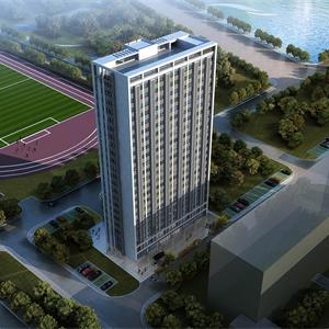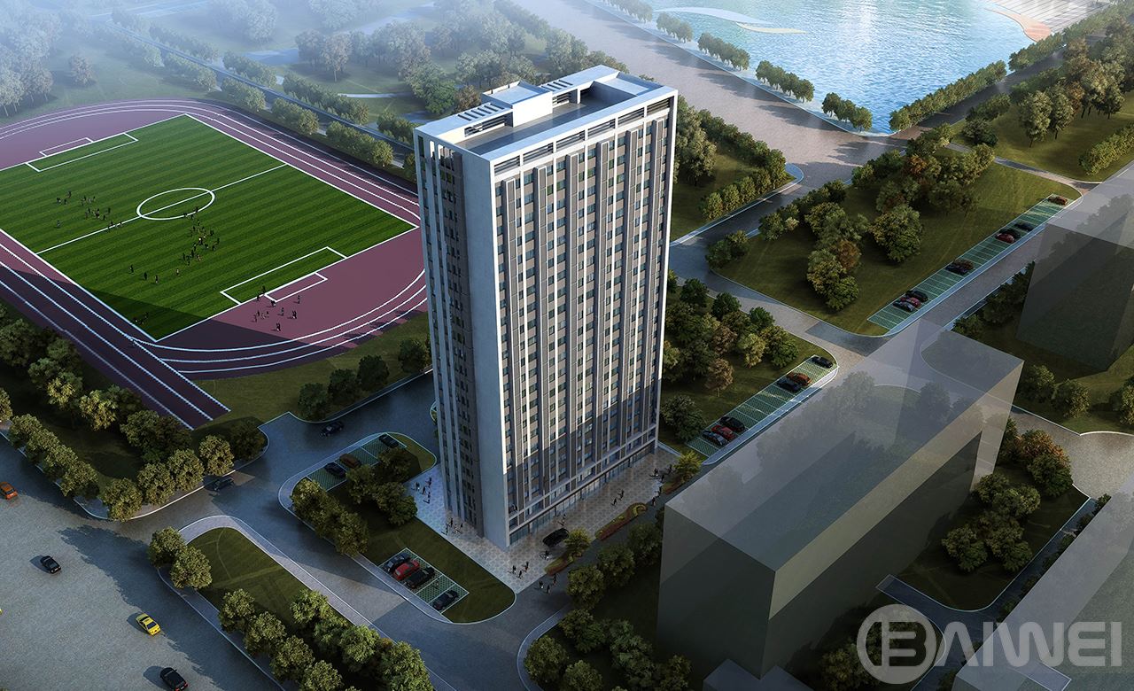 項目位于煙臺市萊山區(qū)港城東大街,包括擬新建3#教學(xué)樓與學(xué)生宿舍。建筑形體上采用保溫節(jié)能效果優(yōu)越的長方體造型,墻面規(guī)整整潔,盡量減少形體凹凸帶來的外墻面積的增加,降低主動能耗節(jié)能減排的綠色建筑。接近黃金分割比例的長邊與短邊比例,二十二層的高度視覺效果極佳。立面舒緩的多層體量強調(diào)水平線條,深色金屬質(zhì)感的凸窗與淺白色外墻產(chǎn)生強烈的視覺沖擊力,體現(xiàn)理性、沉穩(wěn),同時又不失現(xiàn)代、激情的一面。建筑中部的高聳的鐘樓,象征蒸蒸日上的精神。更好的突出了年輕人的生活狀態(tài),激發(fā)莘莘學(xué)子的學(xué)習(xí)熱情,完美的詮釋了E時代的大學(xué)校園生活。