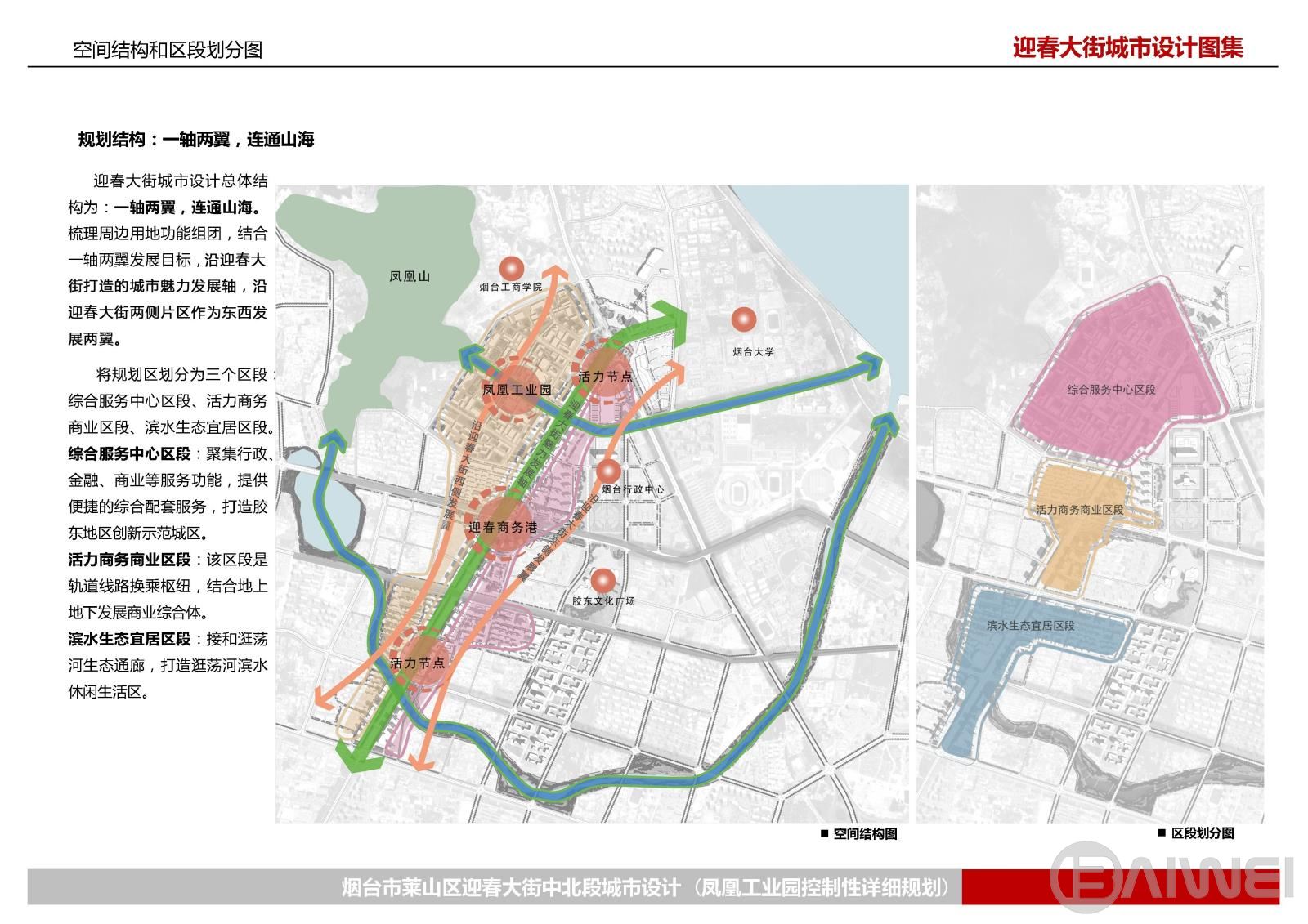 迎春大街位于煙臺市萊山區(qū)北部城區(qū)中心地段,北起觀海路,南至軫大路,全長約3.5公里。本次范圍約2.5平方公里,其中鳳凰工業(yè)園約1.1平方公里。本項(xiàng)目為突出迎春大街作為萊山區(qū)主要商業(yè)商務(wù)發(fā)展軸線所承載的功能和地位,推進(jìn)山東省新舊動能轉(zhuǎn)換,加快鳳凰工業(yè)園區(qū)改造提升,從街道交通整治、形象提升、生態(tài)修補(bǔ)三個(gè)方面出發(fā),分別提出相應(yīng)的設(shè)計(jì)策略,對迎春大街(鳳凰工業(yè)園)風(fēng)貌進(jìn)行改造提升。形成“一軸兩翼、聯(lián)通山?!钡囊?guī)劃結(jié)構(gòu),劃分綜合服務(wù)中心區(qū)、活力商務(wù)商業(yè)區(qū)、濱水生態(tài)宜居區(qū)三個(gè)區(qū)段。并針對每個(gè)區(qū)段土地利用規(guī)劃、建筑高度和開發(fā)強(qiáng)度等提出控制要求。