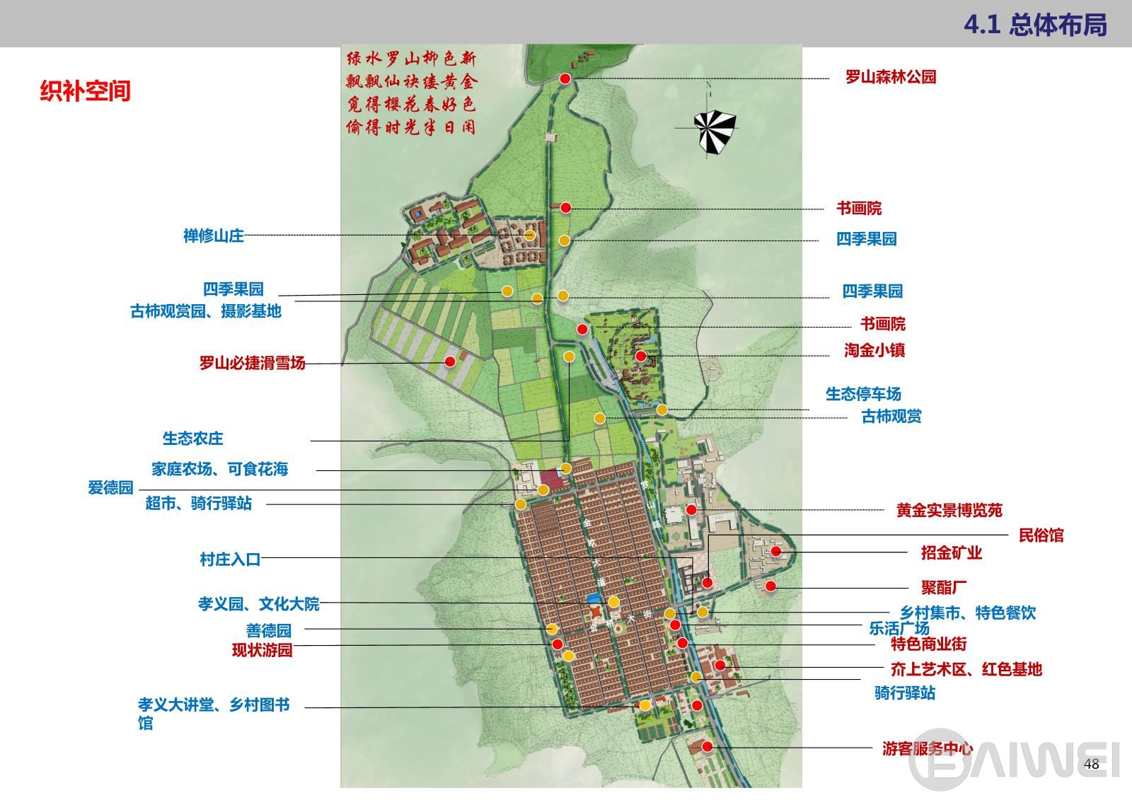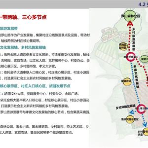 規(guī)劃充分挖掘“生態(tài)、歷史文化”資源,以“黃金文化”為特色,大力發(fā)展現(xiàn)代農(nóng)業(yè)、休閑度假、康體養(yǎng)生、文化體驗等功能。打造宜居宜業(yè)宜游示范村,綠意新韻黃金特色文化村,羅山旅游服務(wù)基地。