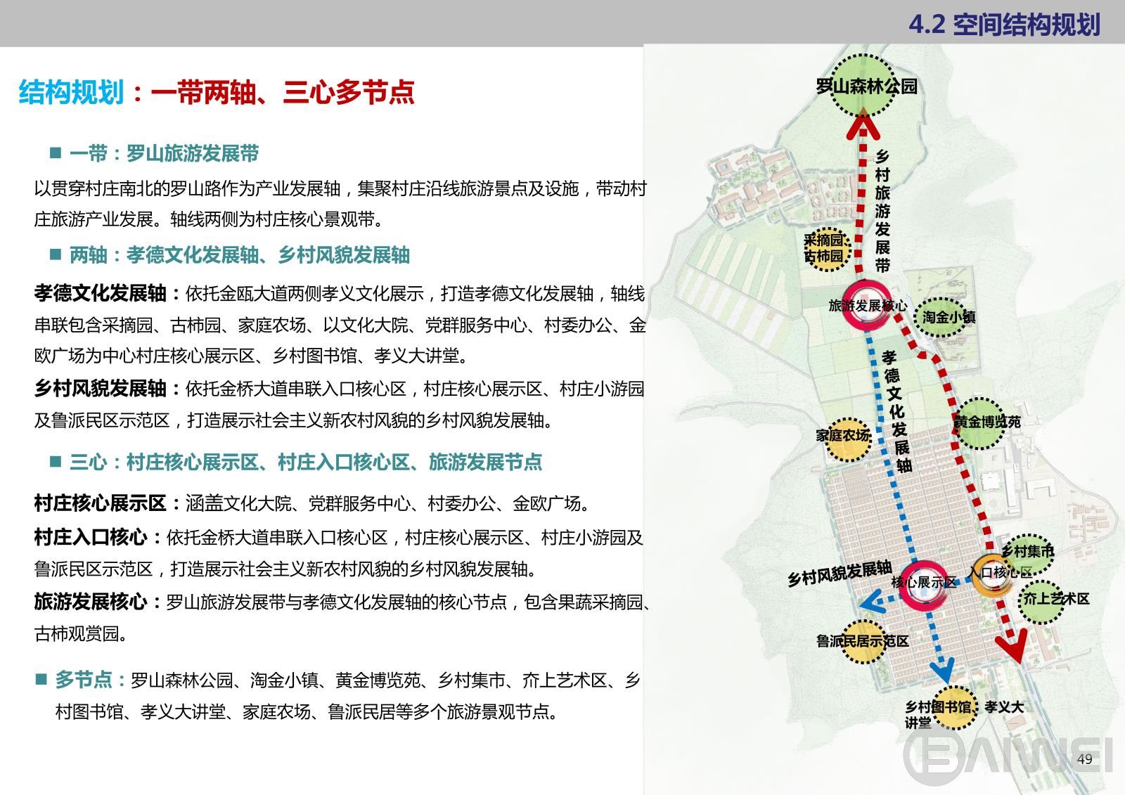 規(guī)劃形成“一帶兩軸、三心多節(jié)點”的空間結(jié)構(gòu)?!耙粠А绷_山旅游發(fā)展帶;“兩軸”孝德文化發(fā)展軸、鄉(xiāng)村風(fēng)貌發(fā)展軸;“三心”村莊核心展示區(qū)、村莊入口核心區(qū)、旅游發(fā)展節(jié)點;“多節(jié)點”羅山森林公園、淘金小鎮(zhèn)、黃金博覽苑、鄉(xiāng)村集市、夼上藝術(shù)區(qū)、鄉(xiāng)村圖書館、孝義大講堂、家庭農(nóng)場、魯派民居等多個旅游景觀節(jié)點。