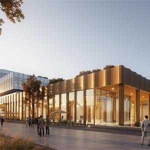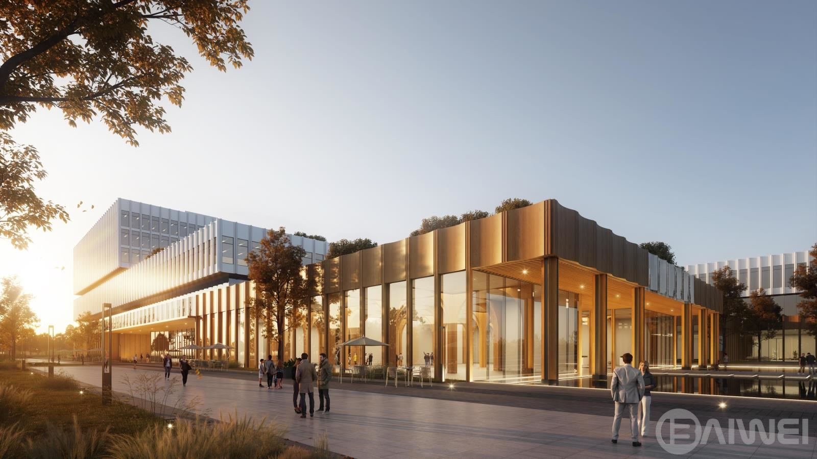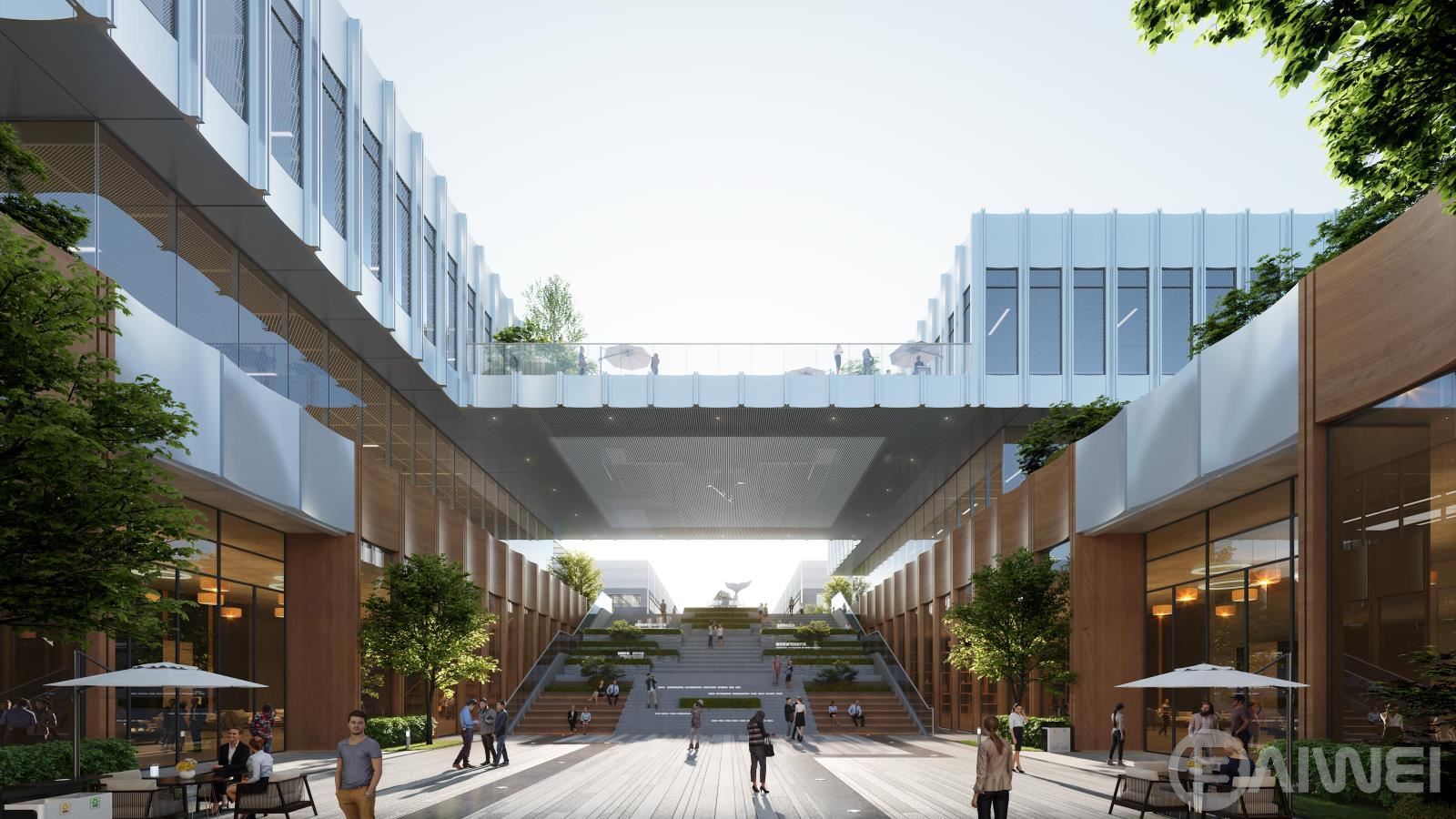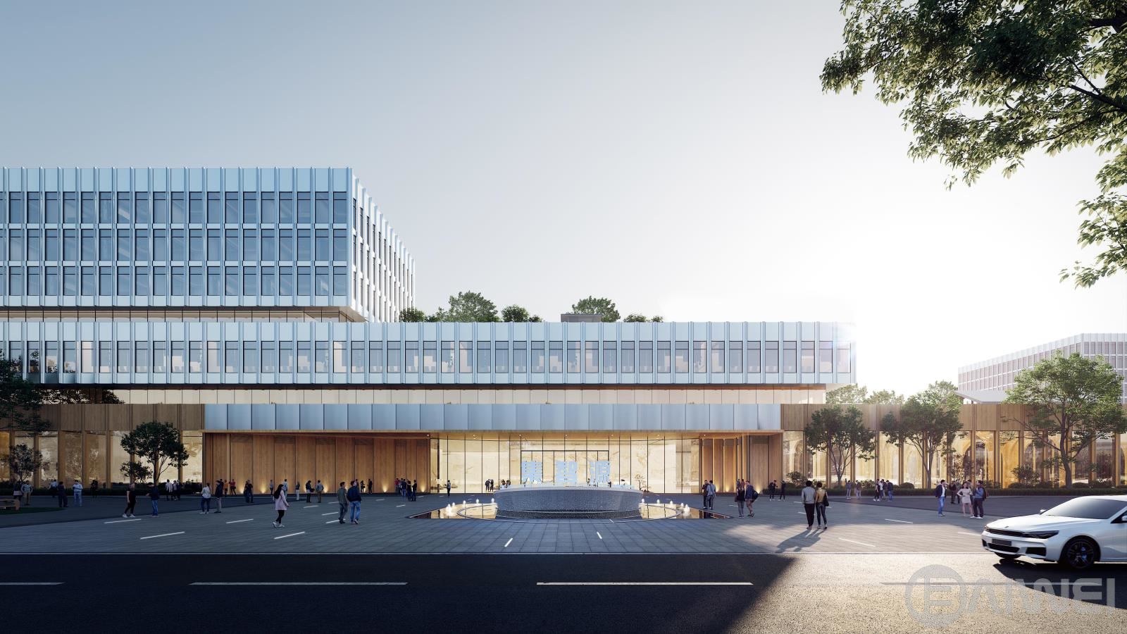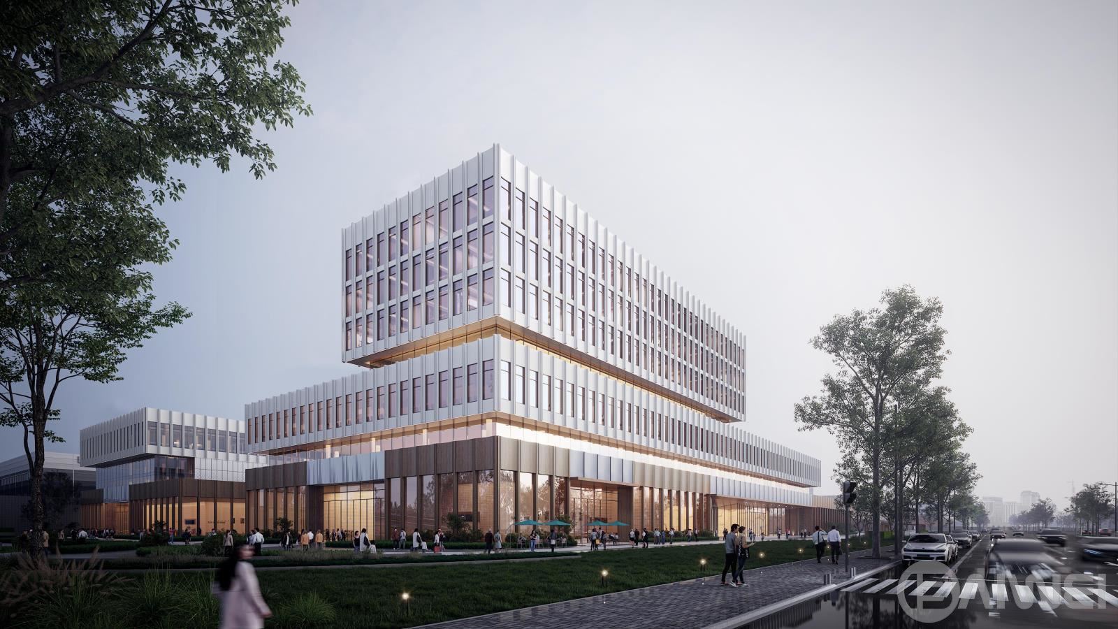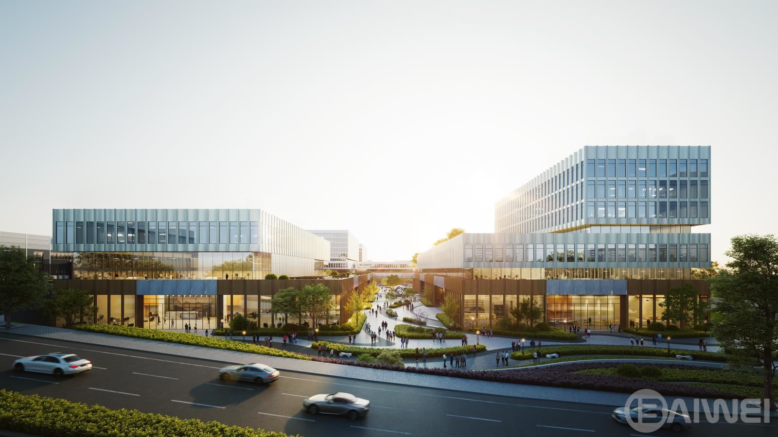 總體造型整體考慮,方案從海上平臺(藍鯨壹號)汲取靈感,以模塊化的空間為基準(zhǔn),通過合理的柱網(wǎng)規(guī)劃,方正靈活配置功能空間,打造高適應(yīng)性產(chǎn)品,實現(xiàn)多重使用模式的靈活切換。立面設(shè)計手法簡潔利落,普通窗墻體系設(shè)計,控制造價,形成簡潔大氣、體量感明顯的建筑形象,同時又不失細節(jié)。“科技創(chuàng)新”與“綠色生態(tài)”相結(jié)合的零碳設(shè)計是本項目的亮點,結(jié)合展廳,跌落的屋頂平臺成為辦公場所的二次延伸,同時屋頂亦可有效調(diào)節(jié)微氣候,降低頂層室內(nèi)空間氣溫調(diào)節(jié)的能耗,為園區(qū)提供生態(tài)和諧的辦公研發(fā)環(huán)境。廠房亦延續(xù)海工平臺理念,廠區(qū)立面采用從深至淺,從海洋到天空。結(jié)合不同金屬板顏色,做出細節(jié)變化,控制造價的同時,又形成簡潔現(xiàn)代的廠房形象。